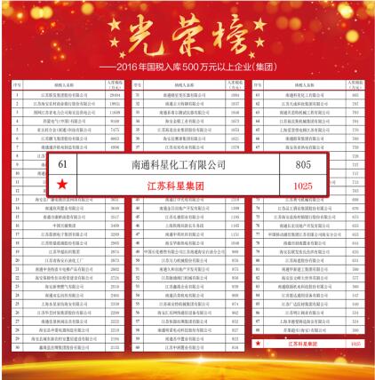 2016年,在縣委縣政府和南通市國稅局的正確領導下,江蘇科星集團暨南通科星化工有限公司實現(xiàn)集團公司稅收超千萬,堅持以環(huán)保、安全、消防、質(zhì)量、節(jié)能、高效的經(jīng)營理念,取得了驕人業(yè)績。