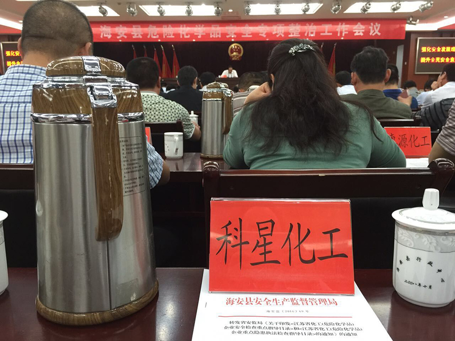 6月7日,海安縣危險化學(xué)品安全專項工作會議在縣政府報告廳舉行。 南通科星化工有限公司董事長吳龍鐵親自參加會議。
